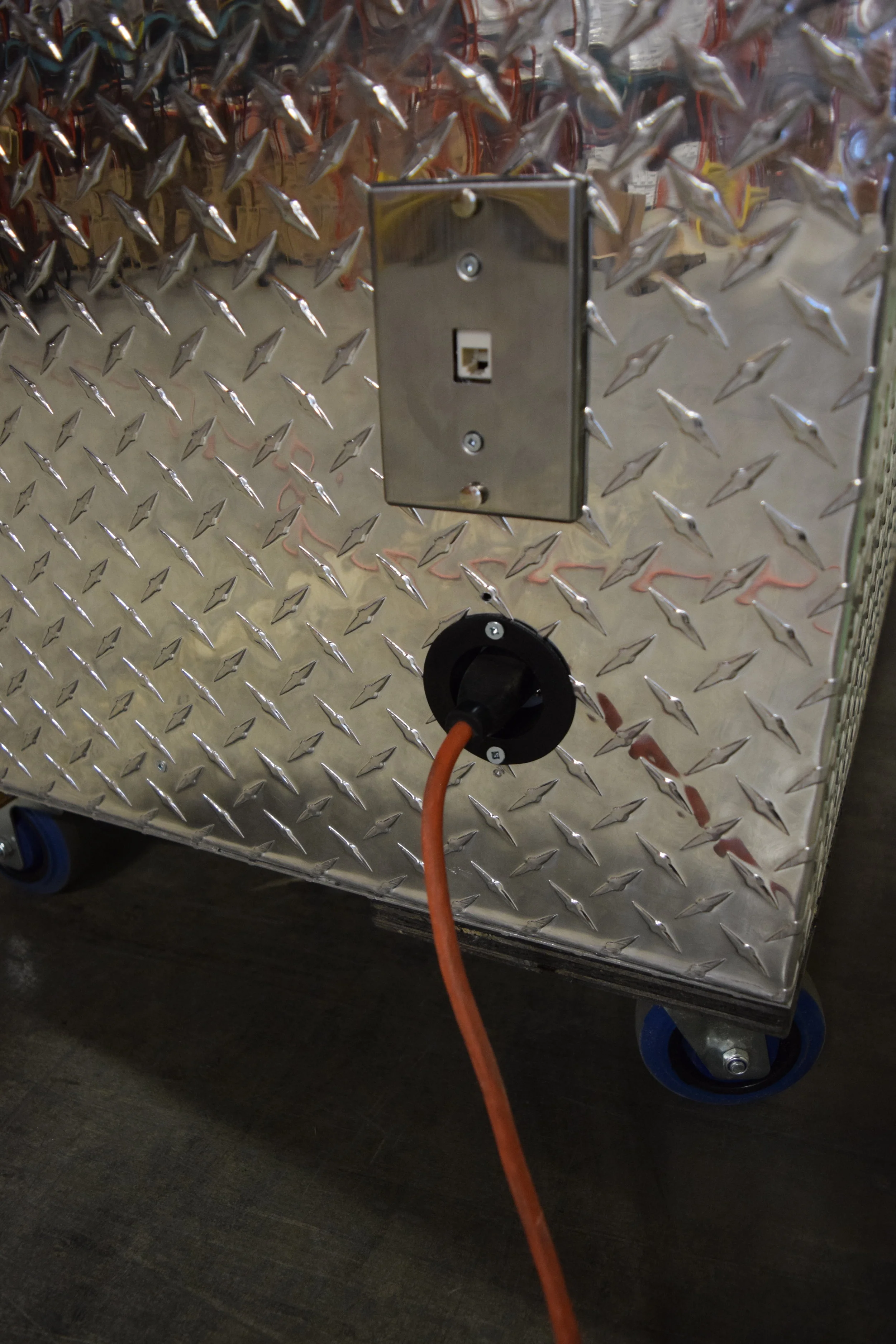 The mobile, collapsible multimedia center! Ergonomically designed for user comfort while constructed with lightweight, water resistant and heavy duty aluminum material. Motorized 50” TV Monitor lift, dual pull-off lids/tables with foldable chairs, optional large pull-out magnetic white board, electrical outlets with USB ports, work desk surface.